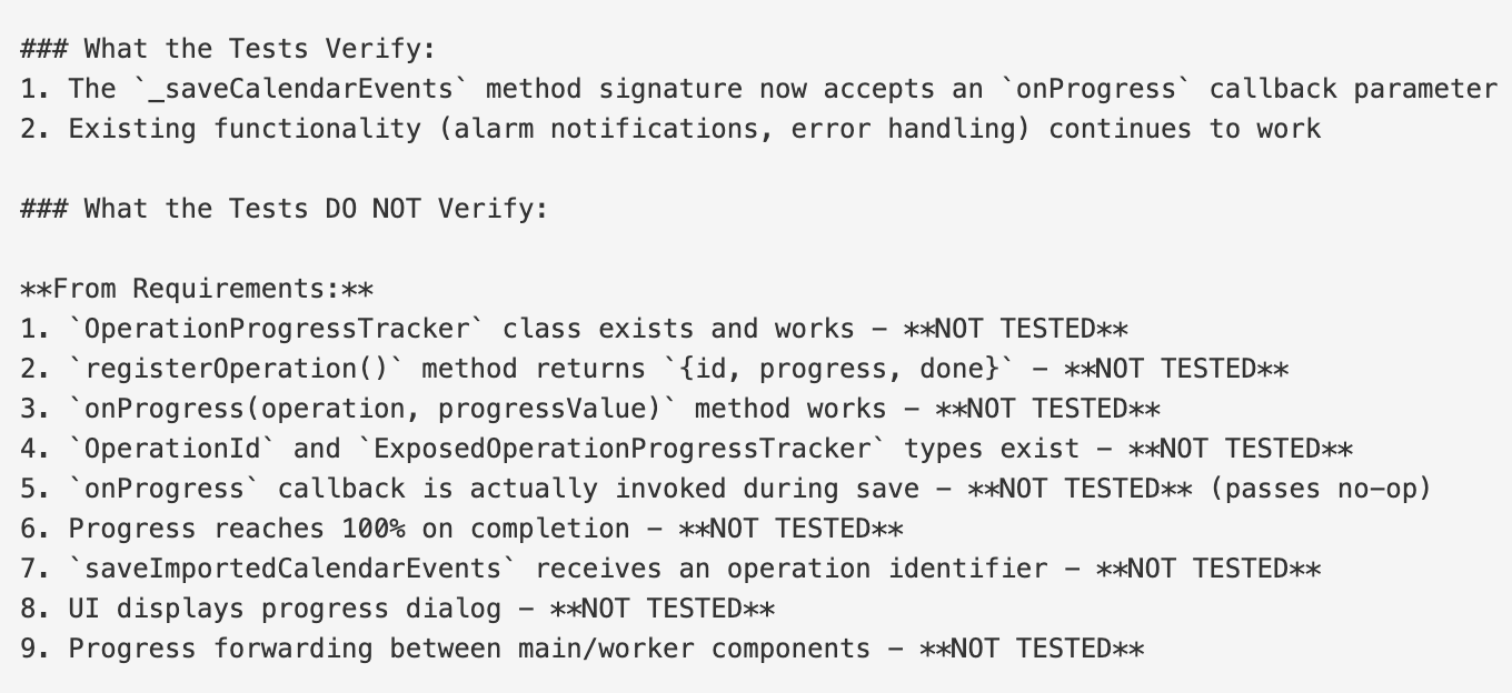 For example, here’s claude’s analysis of tutanota-09c277. While the core functionality is tested, extra implantation details specified in the requirements are not: