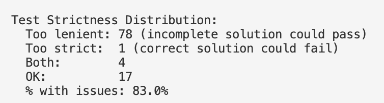 Using a similar methodology to my Terminal-Bench 2 audit. This time, I also searched for cases where the tests were too strict.